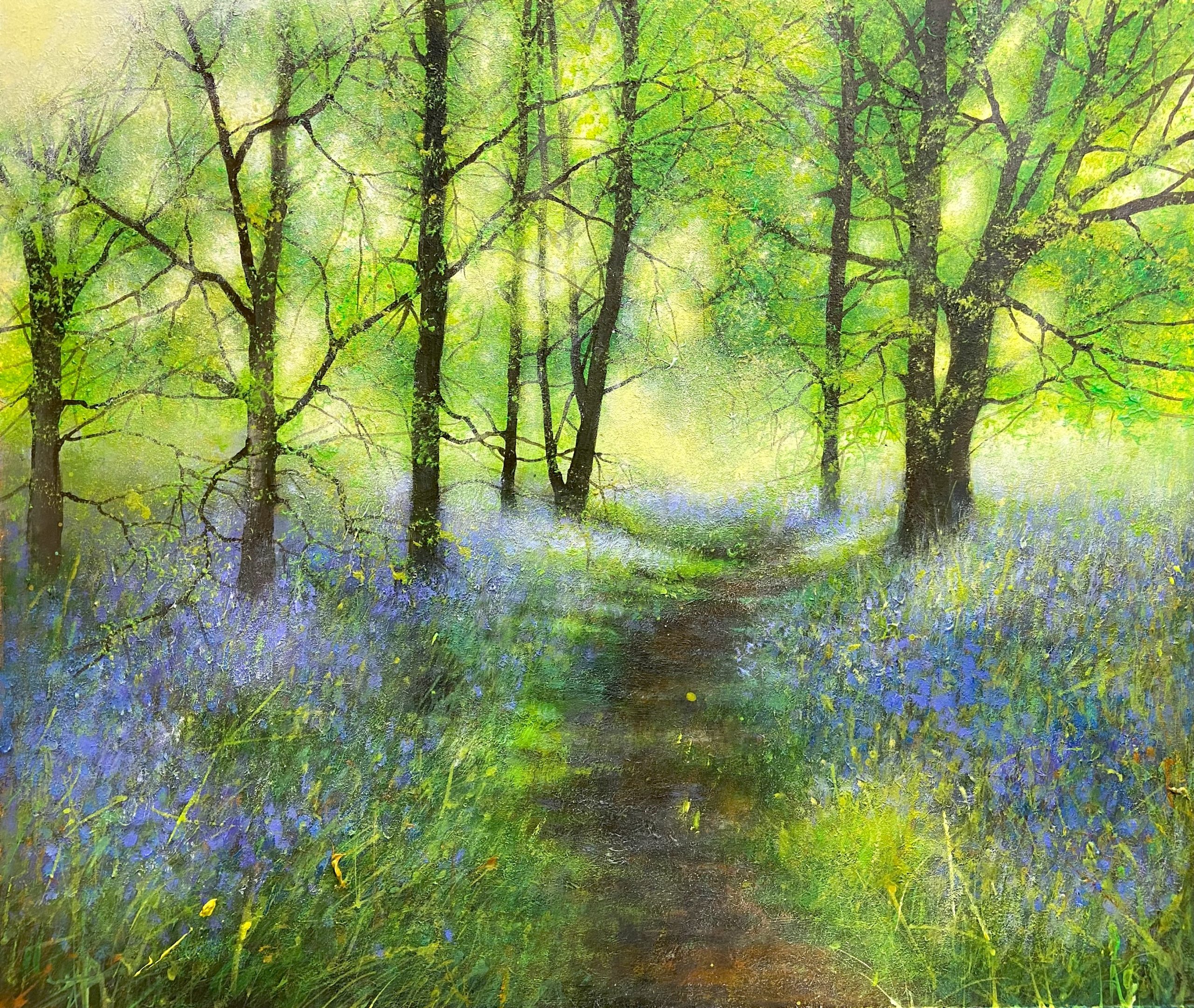 Inspired by the English countryside as it begins to flourish, this composition reflects the season in transition — meadows alive with colour, trees newly in leaf casting dappled shade, and soft sunlight filtering through branches to create depth, warmth and atmosphere.
