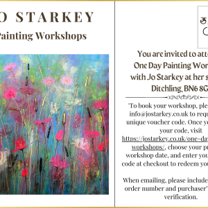 ‘To book your workshop, please email info@jostarkey.co.uk to request your unique voucher code. Once you receive your code, visit https://jostarkey.co.uk/one-day-painting-workshops/, choose your preferred workshop date, and enter your voucher code at checkout to redeem your booking’.