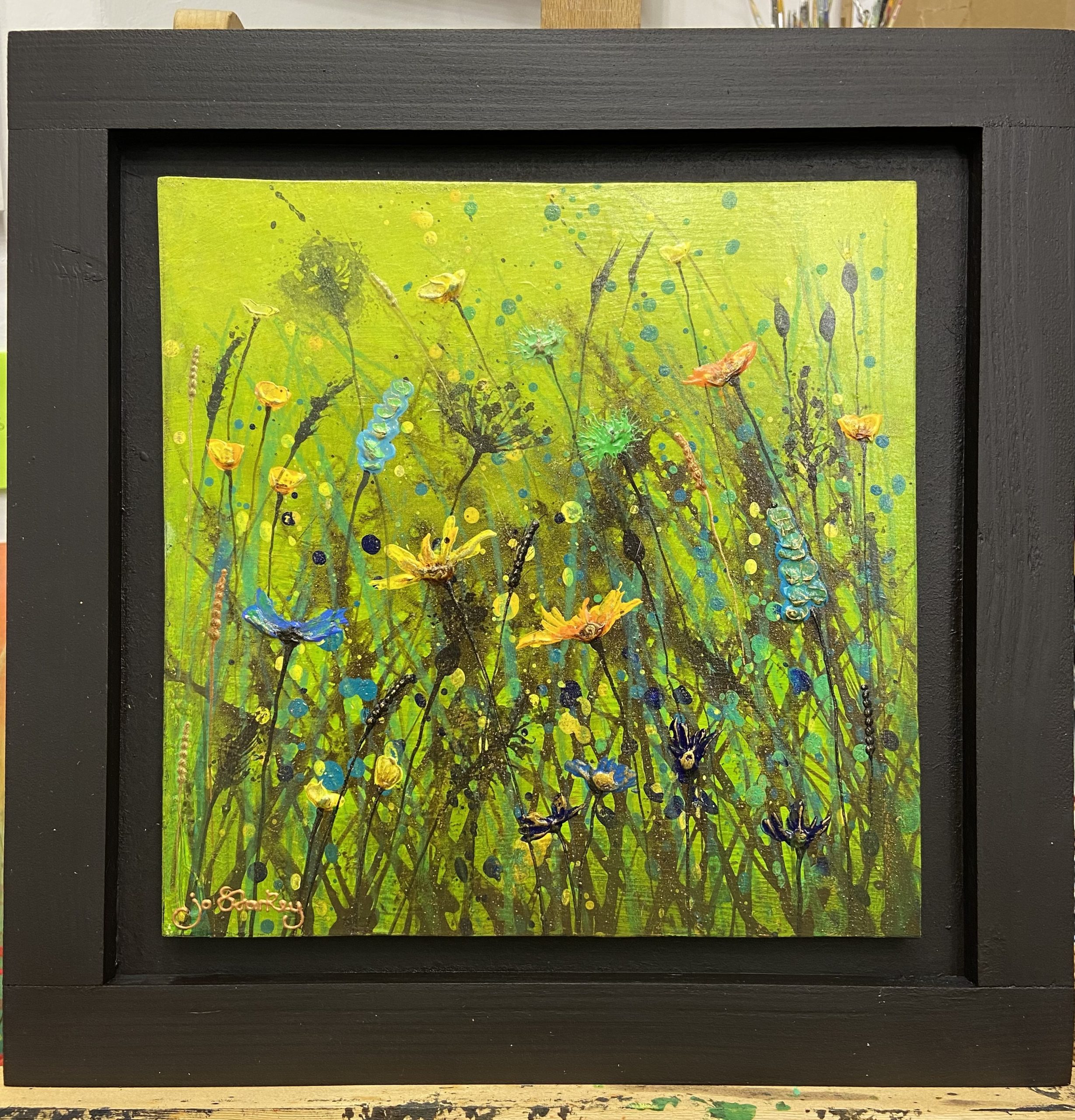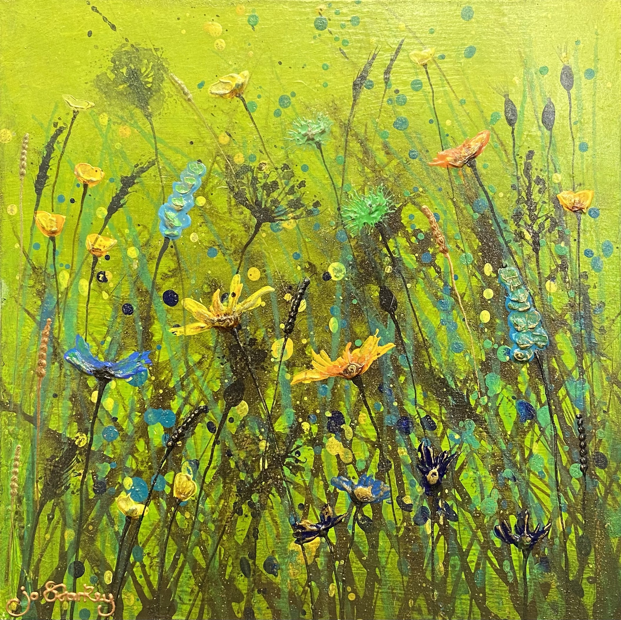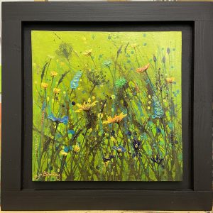 Alive with colour, energy and movement, this contemporary wildflower painting captures the vibrant spirit of a summer meadow in full bloom. Set against a luminous field of layered greens, delicate stems, seed heads and expressive florals rise and intertwine.