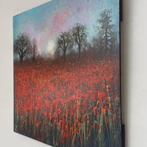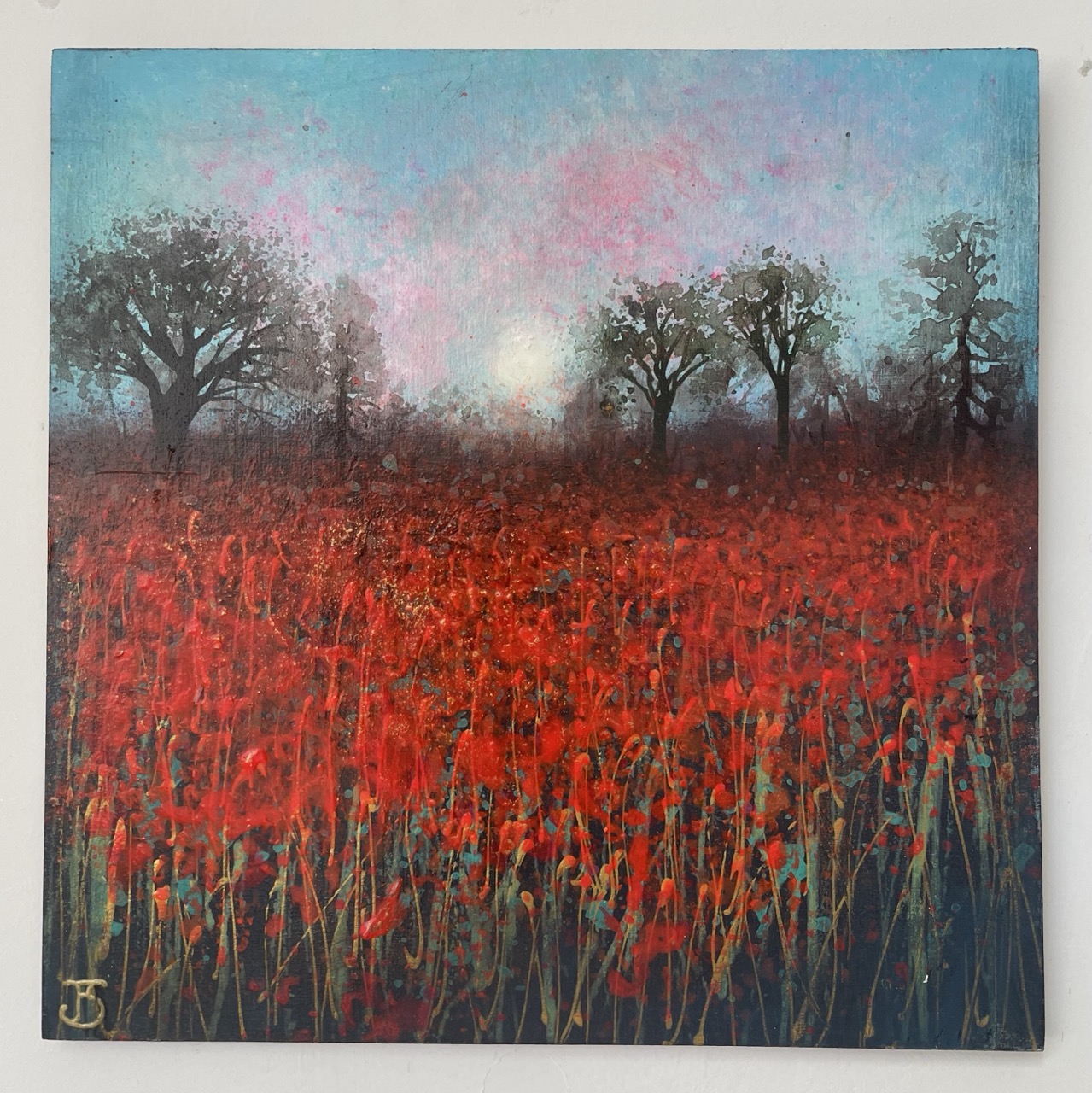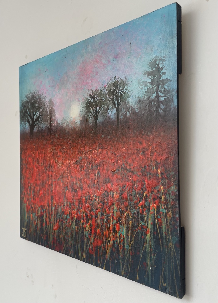 A glowing field of scarlet poppies stretches to the horizon, bathed in the warm, golden light of the setting sun.