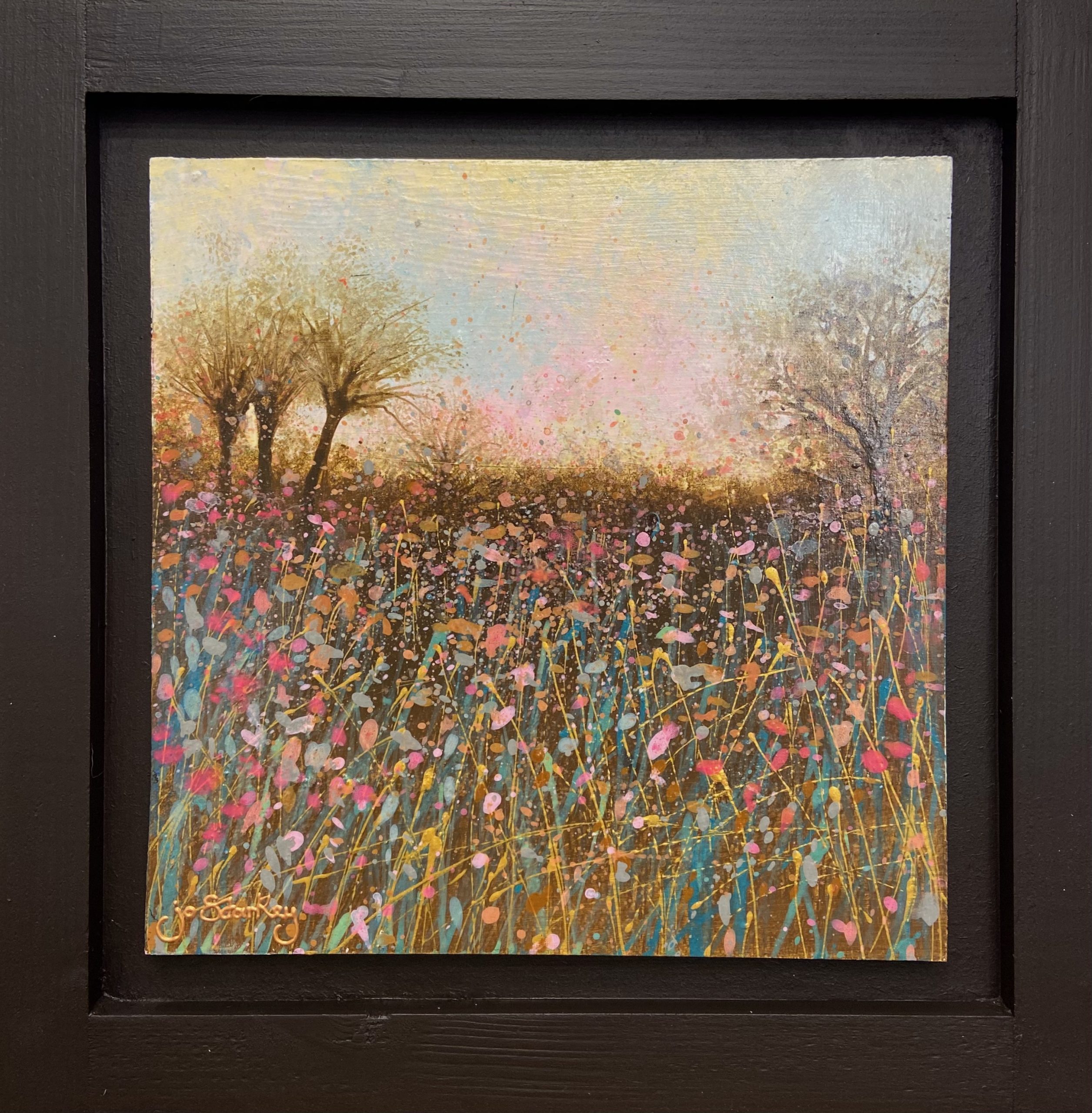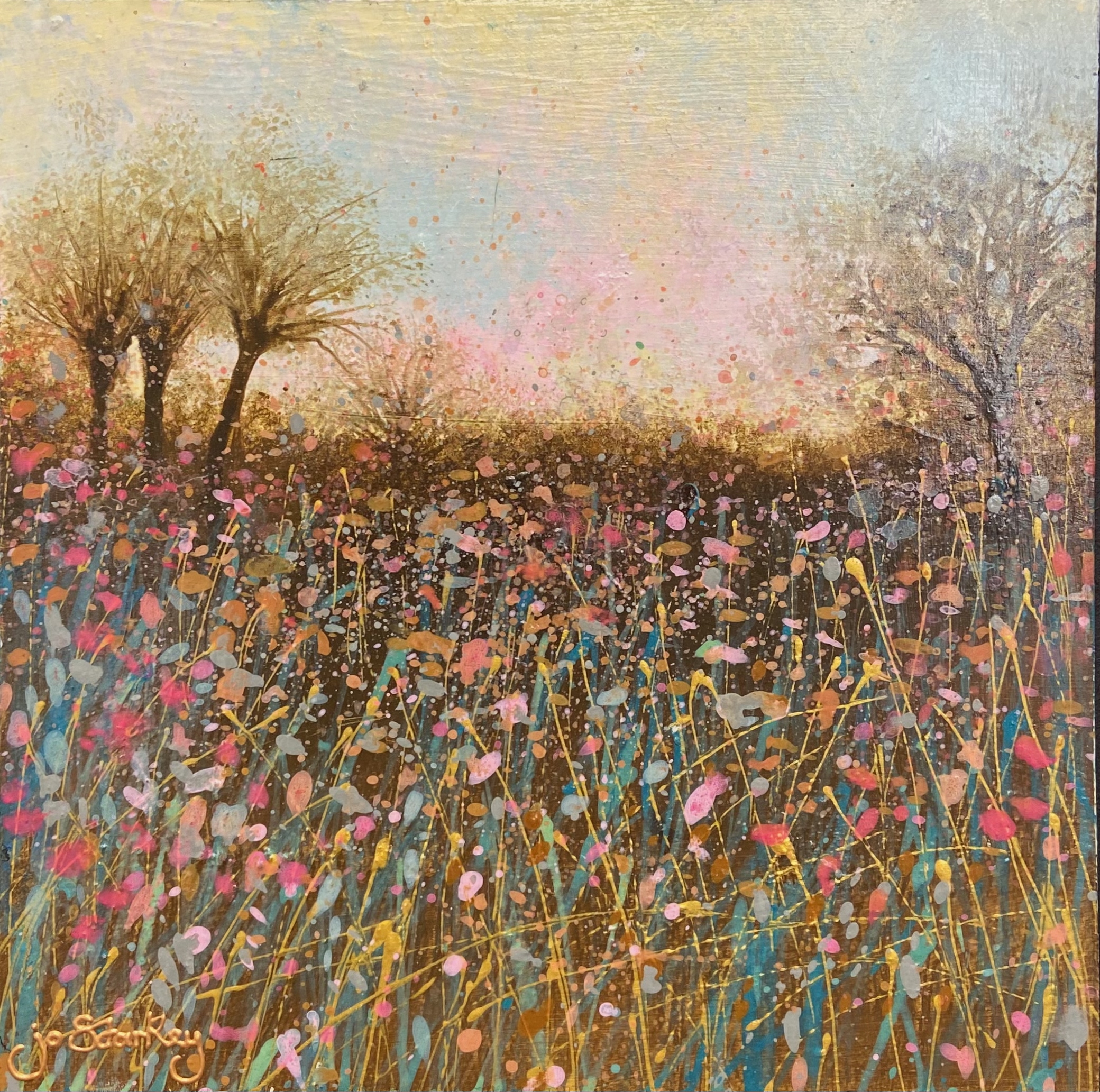 A softly atmospheric meadow landscape, this contemporary painting captures the quiet glow of fading light across a wildflower field. Silhouetted trees stand gently against a luminous sky, while a richly textured foreground of delicate stems, seed heads and scattered blooms creates rhythm, depth and movement throughout the composition.